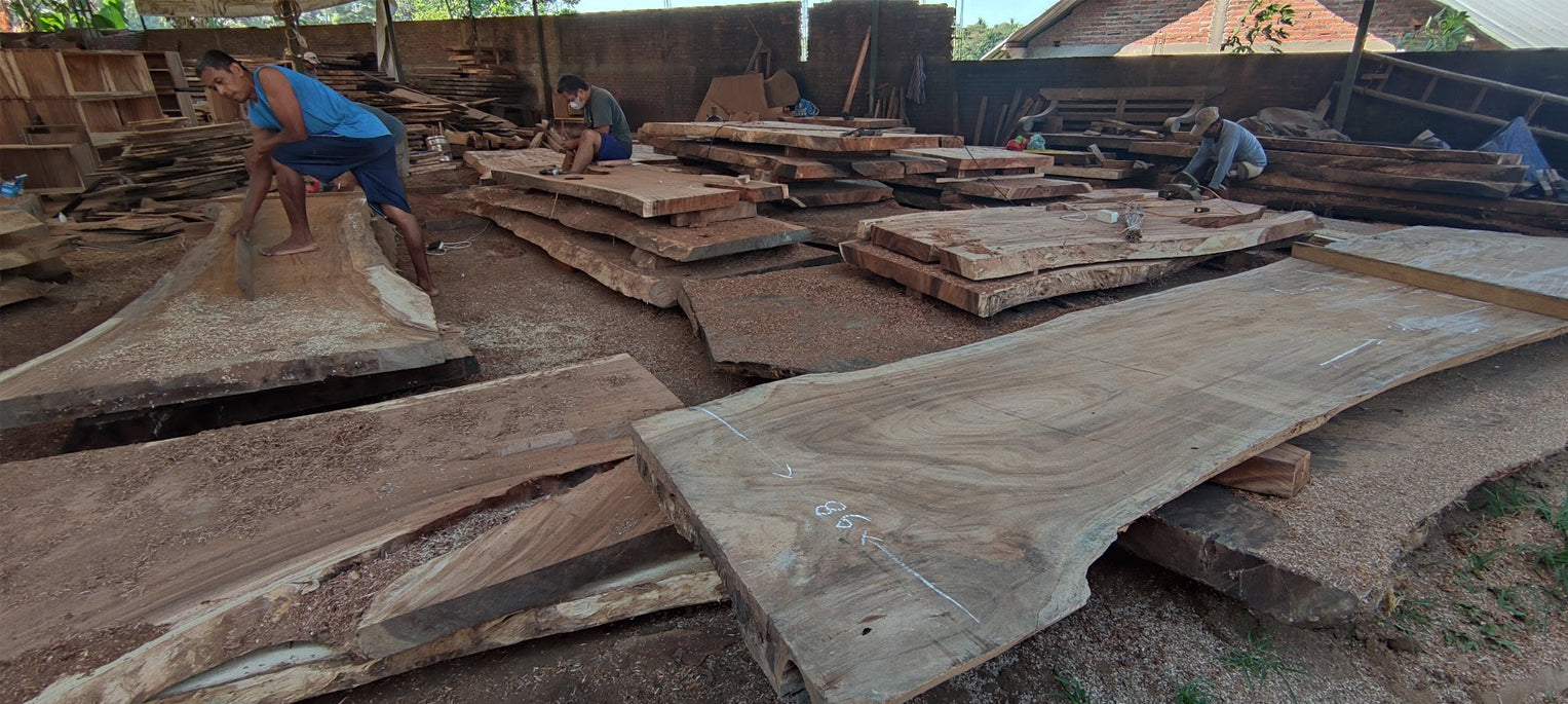Wij kopen onze producten direct bij de bron in Indonesië, bij ambachtelijke makers die met hart en ziel werken. Elk tafelblad wordt zorgvuldig geselecteerd, met oog voor karakter, nerven en unieke vormen. Dankzij onze rechtstreekse lijnen volgen we elke stap van het proces en ontvangen we continu foto’s en video’s van jouw toekomstige tafel. Daarnaast bezoeken we de fabrieken persoonlijk, zodat we de passie en precisie zelf kunnen ervaren. Onze tafels zijn unieke stukjes natuur – geen blad is hetzelfde, elk vertelt zijn eigen verhaal. Om deze schoonheid te behouden, worden de bladen op een natuurlijke manier gedroogd, zodat het gewicht handelbaar blijft en scheuren of kromtrekken zoveel mogelijk worden voorkomen. Ingemaakte draadeinden zorgen voor extra stabiliteit, zodat jouw tafel generaties lang kan meegeven. Door onze jarenlange ervaring weten we precies welke bladen het meest bijzonder zijn, om jou de neusjes van de zalm te bieden. We hebben een hechte, betrouwbare band opgebouwd met de fabrieken, waar goede arbeidsomstandigheden en respect voor het materiaal altijd centraal staan. Zo kun jij met een gerust hart kiezen, wetende dat elk blad met zorg en verantwoordelijkheid tot leven is gekomen. Of je nu kiest voor een watervaltafel, een salontafel, of een ronde eettafel, elk stuk is een investering in een uniek kunstwerk van de natuur, speciaal voor jou gemaakt.